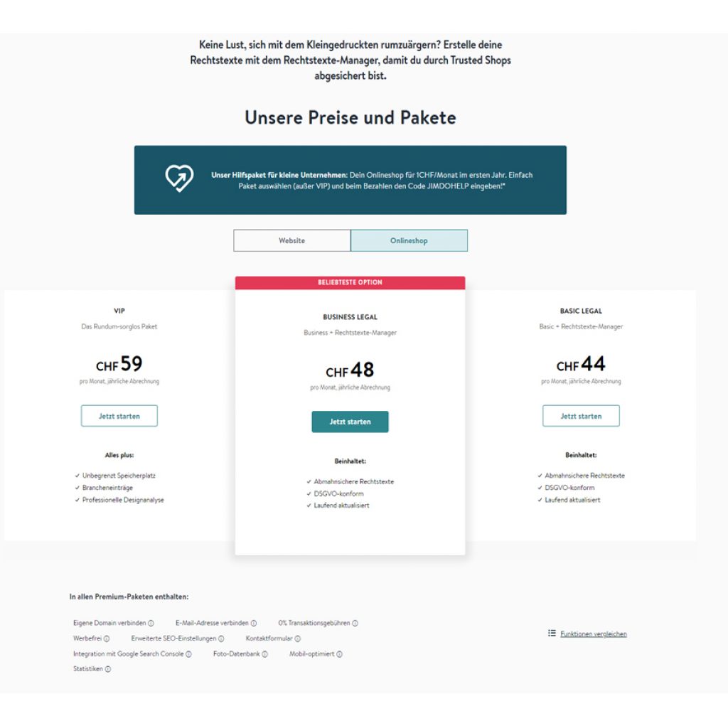 Für 12.00 CHF statt 528.00 CHF (Basic Legal) bzw. 576.00 CHF (Business Legal) für das erste Jahr mit eigener Domain, SSL-Zertifikat, Anbindung an Zahlungssysteme von PayPal und Stripe, SEO-Funktionen, Mobil-optimiert, 0% Transaktionskosten seitens Jimdo, etc. finde ich es, gerade für den Start eines eigenen Online-Shops, ein HAMMER-Angebot.