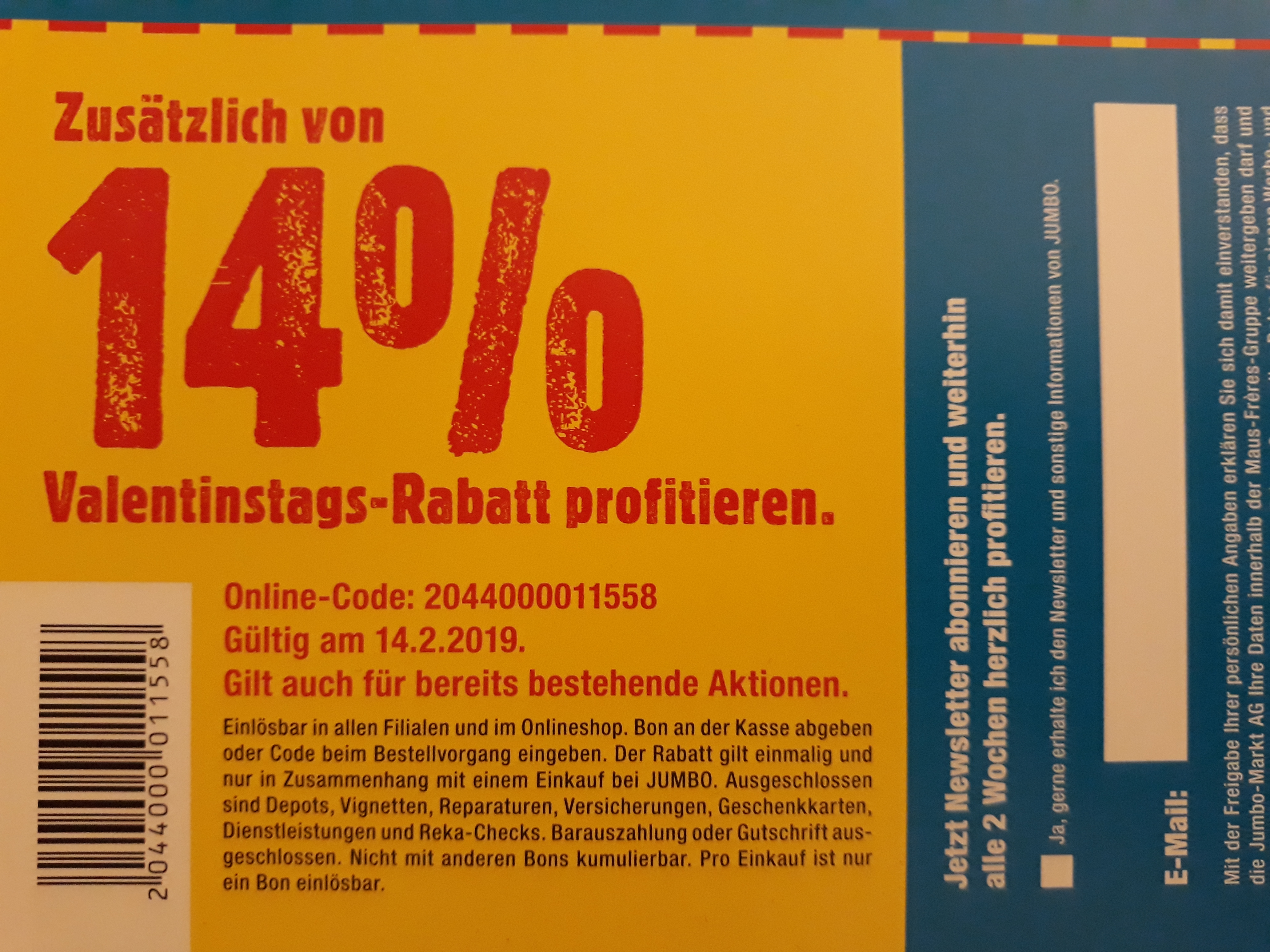 Bei Jumbo gibt es am Valentinstag zusätzliche 14% Rabatt. Nur gültig am 14.02.2019.