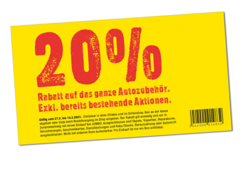 Bei Jumbo gibt’s gerade 20% Rabatt auf das ganze Autozubehör Sortiment. Ausgenommen sind Aktionspreise.