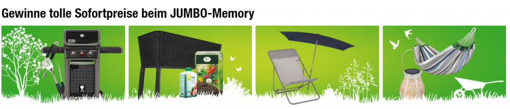 Bei Jumbo gibt es aktuell zur Frühlings Aktion ein Memory Spiel mit Sofortpreisen. Ausserdem könnt ihr noch beim Gewinnspiel teilnehmen um eine Chance auf eine Coop Geschenkkarte im Wert von CHF 1000.- oder auf einen von zwei Outdoorchef-Gasgrills.