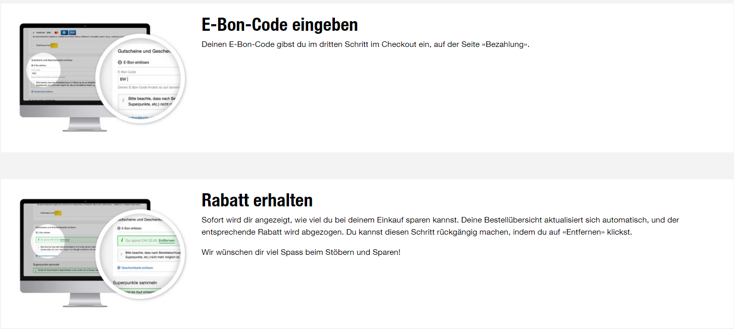 - Sofort wird dir angezeigt, wie viel du bei deinem Einkauf sparen kannst. Deine Bestellübersicht aktualisiert sich automatisch, und der entsprechende Rabatt wird abgezogen. Du kannst diesen Schritt rückgängig machen, indem du auf «Entfernen» klickst.Wir wünschen dir viel Spass beim Stöbern und Sparen!