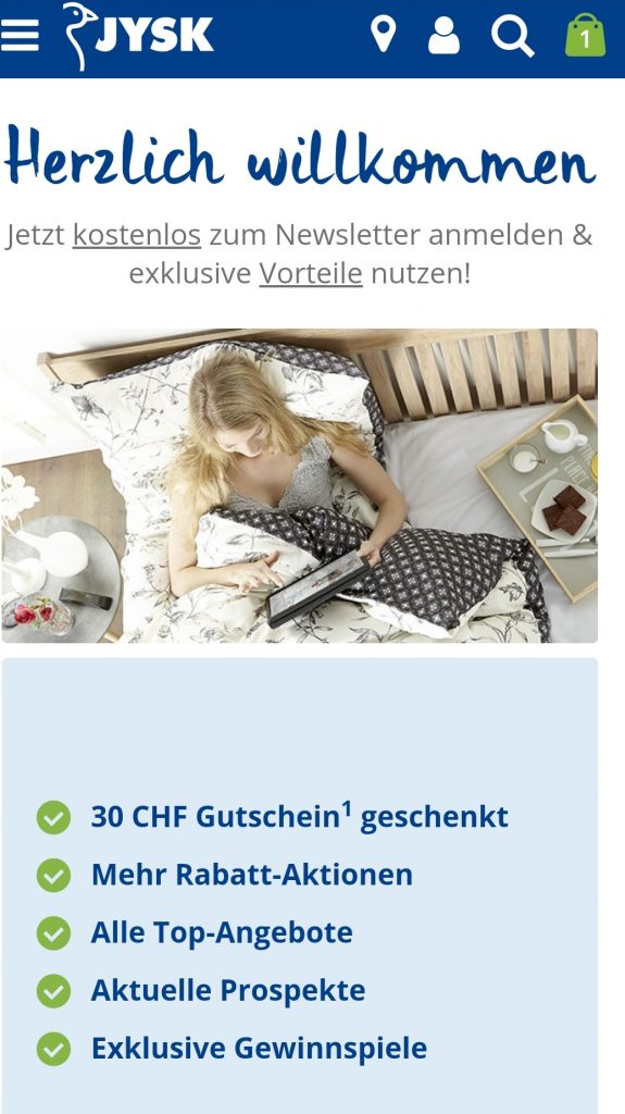 Ich habe gerade gesehen, dass JYSK einen sagenhaften CHF 30.- Gutschein schenkt, wenn man sich beim Newsletter anmeldet.
