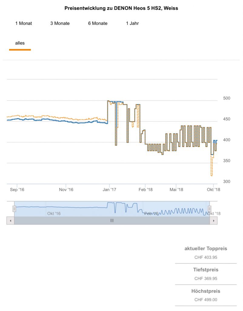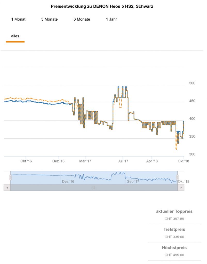 Gemäss toppreise gab es den Lautsprecher über beide Farben bislang nie günstiger als für 319.05 CHF, der zweitbeste Preis liegt aktuell bei 395.85 CHF.