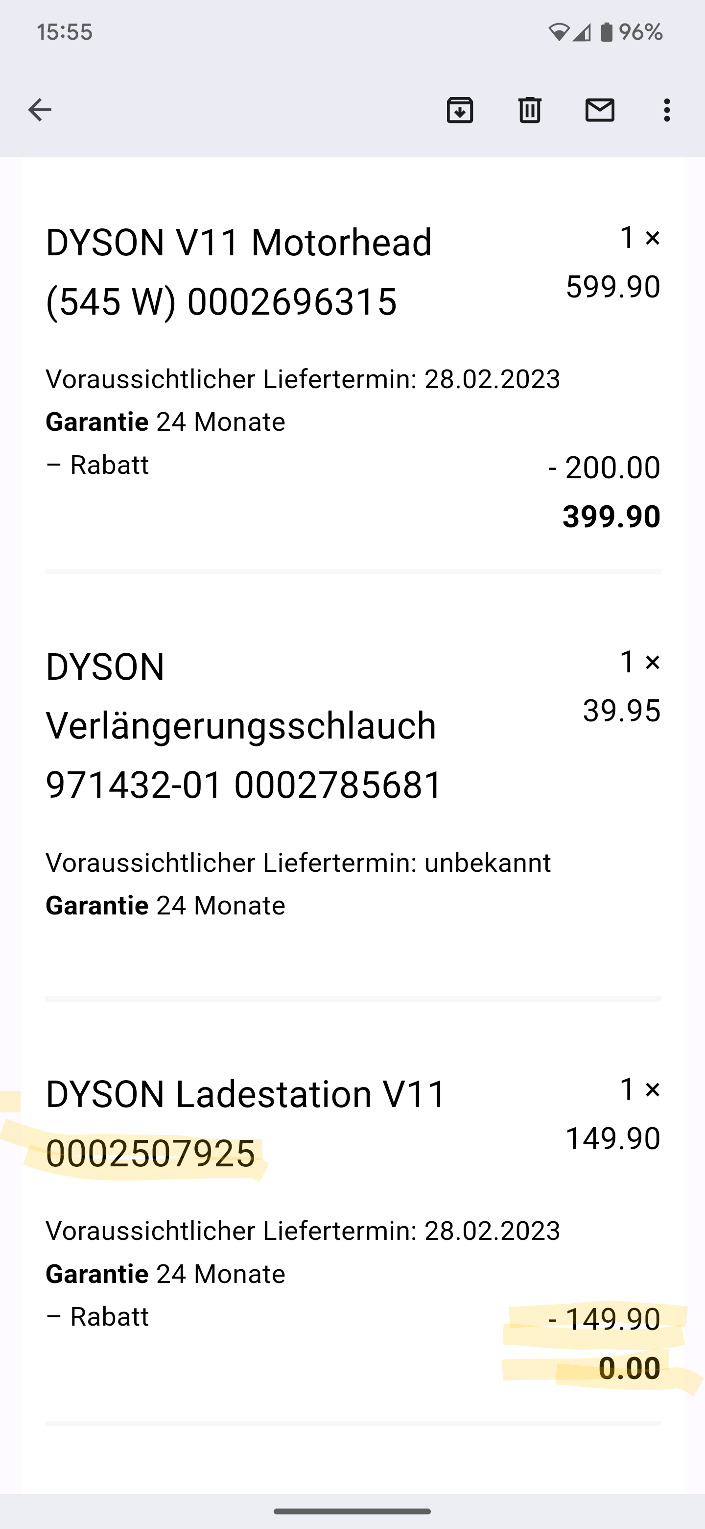 Ich konnte gerade noch folgenden Artikel kostenlos dazu bestellen: DYSON Ladestation V11 0002507925 (CHF 0.00 statt CHF 149.00)!