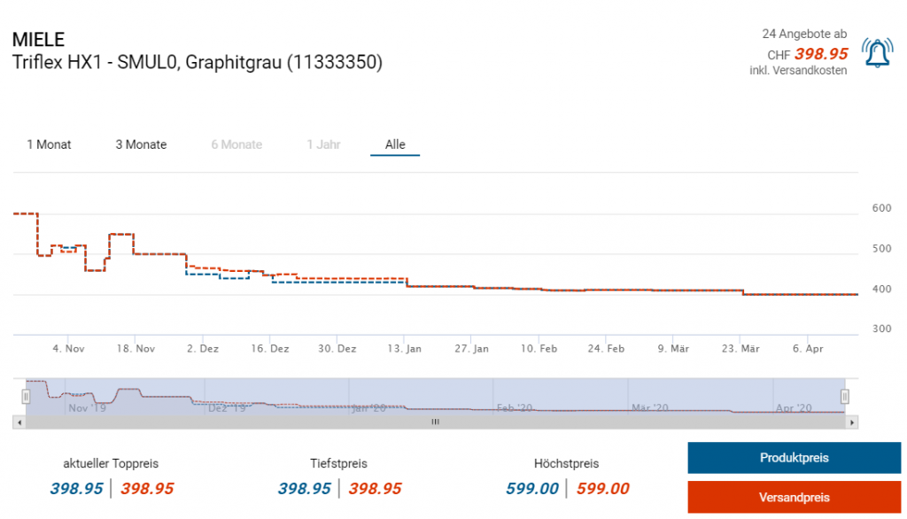 Bei nettoshop gibts gerade die Miele Triflex HX1 mithilfe des Gutscheincodes NETTO-15. Bei Fust könnt man ihn zwar sogar für 379 Franken erstehen, allerdings ist dort angegeben, dass der Cashback schon abgezogen ist, ich gebe deshalb digitec-galaxus als Vergleichspreis an.