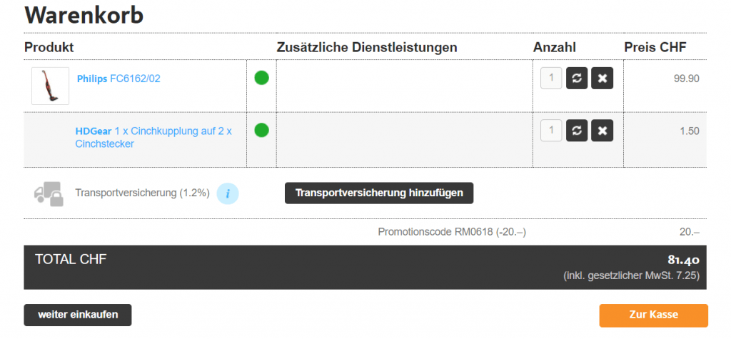 - Schmeisse den Cinch Adapter in den Warenkorb. Oder etwas beliebiges als Füllartikel, damit du im Total 100 CHF kommst…