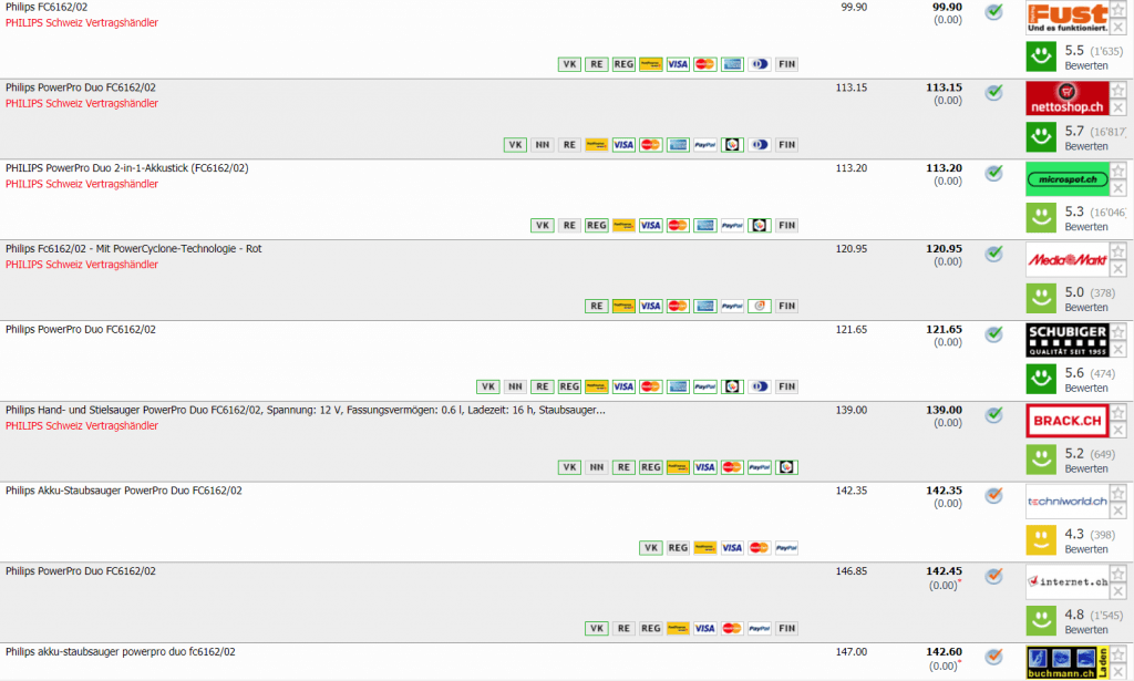 Wer gestern den kabellosen Staubsauger bei nettoshop verpasst hat, hat jetzt die nächste Chance auf ein günstiges Modell. Den Philips PowerPro Duo FC6162/02 gibt’s bei Fust mit unserem Trickli (siehe unten) für CHF 81.40. Der zweitbeste Preis in der Schweiz ist momentan bei CHF 113.15. Bestpreis war bei CHF 99.-