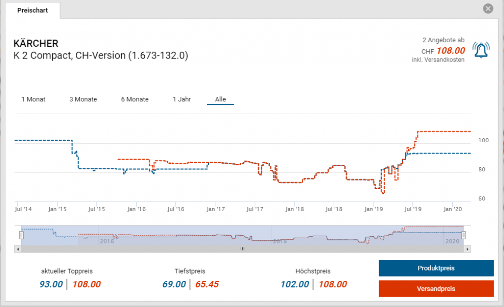 Bei Coop Bau+Hobby gibt es den Kärcher Hochdruckreiniger K 2 für den Toppreis von CHF 69.95. Im Februar 2019 war der Hochdruckreiniger noch CHF 5.- günstiger, seitdem aber nie mehr auf dem Level. Der zweitbeste Preis beträgt CHF 108.-.