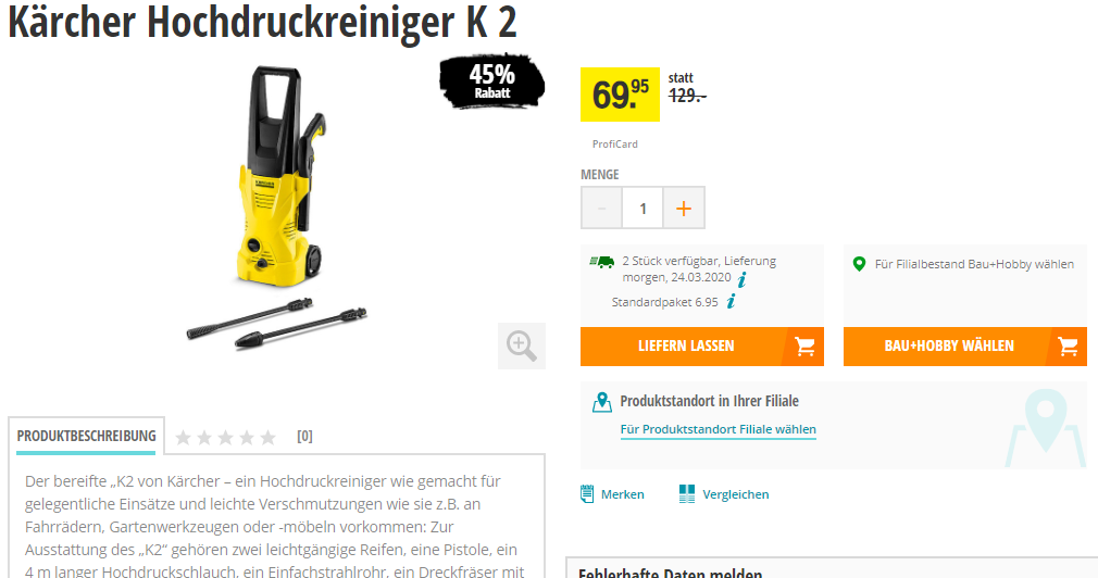Bei Coop Bau+Hobby gibt es den Kärcher Hochdruckreiniger K 2 für den Toppreis von CHF 69.95. Im Februar 2019 war der Hochdruckreiniger noch CHF 5.- günstiger, seitdem aber nie mehr auf dem Level. Der zweitbeste Preis beträgt CHF 108.-.