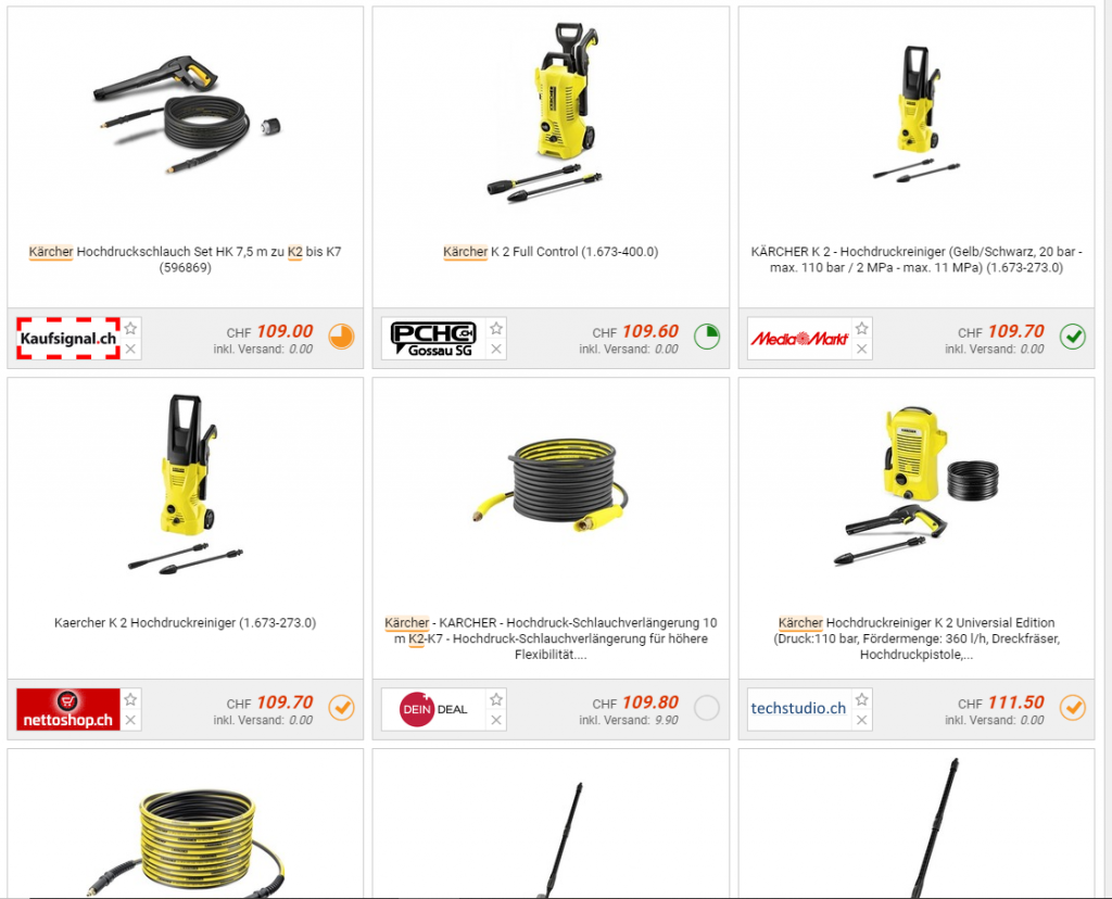 Bei doitgarden.ch gibts derzeit den Hochdruckreiniger Kärcher K2 in Aktion für 77 Franken. Genau diese Version ist nur unter den unkategorisierten Treffern zu finden, da startet der Vergleichspreis bei CHF 109.70. Inwiefern sich diese Version aber von den anderen unterscheidet kann ich nur anhand der Bilder abschätzen.