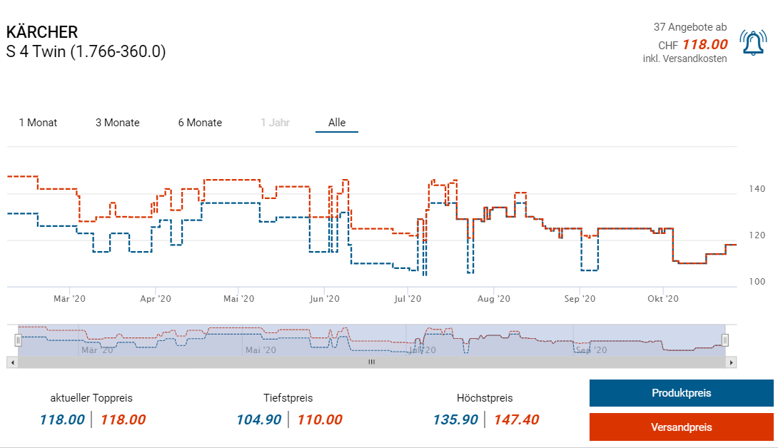 Bei nettoshop gibts derzeit die Kehrmaschine S4 Twin von Kärcher mit dem bekannten 20 Franken Bon zum guten (und scheinbar neuen) Bestpreis von 105 Franken, ansonsten starten die Preise ab CHF 118.-