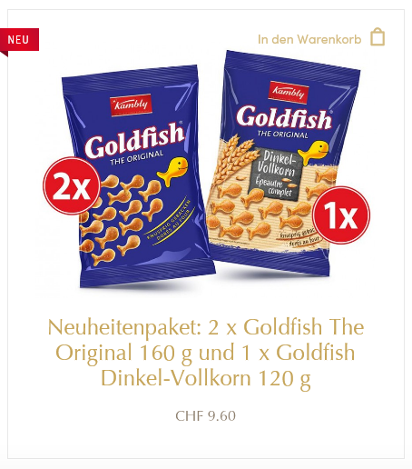 Nachdem unser geschätzter Bierbaron „zuruckl“ uns wieder mit Bierdeals versorgt hat, braucht es natürlich einen (salzigen) Snack dazu. Im Denner sind aktuell die allseits beliebten Goldfish von Kambly im Dreierpack Aktion. Anstatt CHF 9.45 bezahlt man CHF 6.95. Weder bei Migros Partner, Coop, Volg, Otto’s oder im Onlineshop von Kambly sind sie billiger.