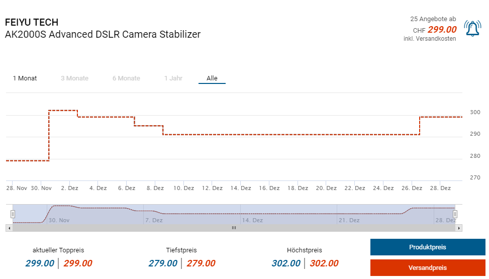 Bei Daydeal gibts gerade im Wochendeal das Kamera-Gimbal AK2000S Advanced von FeiyuTech zum neuen Bestpreis von 249 Franken. Laut toppreise soll der bisher tiefstgemessene Preis bei 279 Franken gelegen haben, derzeitger Zweittiefstpreis liegt allerdings bei 299 Franken (~280 Franken ohne Lieferdatum bei amazon.fr).