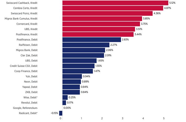 Sofern zumindest überall dieselbe Methodik angewendet wurde (auch wenn sie nicht über jeden Zweifel erhaben sein mag), so ergibt es aus meiner Sicht dennoch ein hilfreiches Bild. So zeigt es z.B., dass eine Radicant-Debitkarte definitiv besser abschneidet, als eine Postfinance-Debitkarte. Vielleicht sind die Prozentsätze nicht zwingend der Weisheit letzter Schluss, aber die Rangfolge dürfte sich nicht gross von der Wirklichkeit unterscheiden. Hast du eine Quelle verfügbar, die zuverlässiger ist und ein realistischeres Bild bietet?