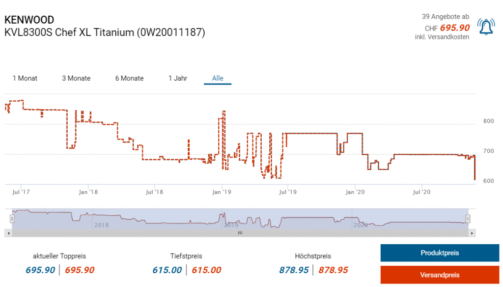 Bei Amazon gibts gerade dieses hammermässige Angebot! Ihr kriegt die Küchenmaschine Kenwood Chef XL Titanium zum neuen Bestpreis von knapp 431 Franken. Laut toppreise lag der bisherige Bestpreis bei etwa 610 Franken, derzeitiger Zweittiefstpreis sind allerdings ca. 696 Franken. Beachtet dass kein Liefertermin angegeben ist und ihr mit mind. 2 Wochen rechnen solltet!