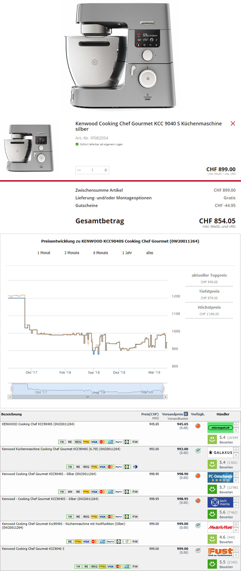 Bis zum 2.4.2019 gibt es bei Nettoshop die Kenwood Cooking Chef Gourmet KCC9040S (6.70l) zum Bestpreis von CHF 854.05 wenn man beim Checkout den 5% Rabattcode PBW-5-1903 (thx @fun4ALL) verwendet.