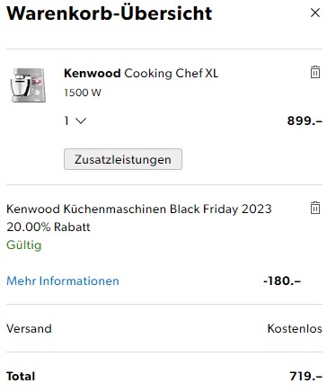 Bei Galaxus gibt’s bis zum 27.11. die Küchenmaschine Kenwood KC95 zum neuen Bestpreis von 848 Franken (CHF 1060 – 20% Rabatt auf ausgewählte Küchenmachine bei Galaxus).