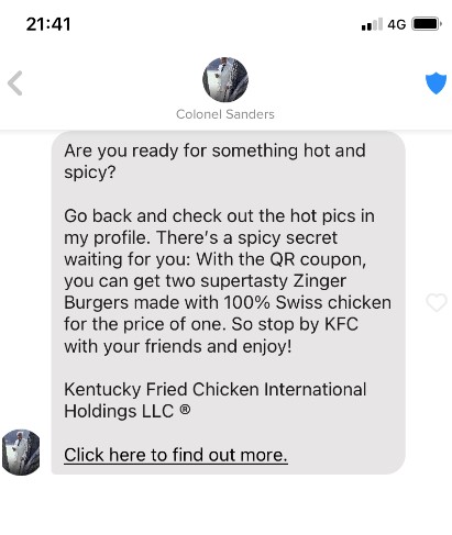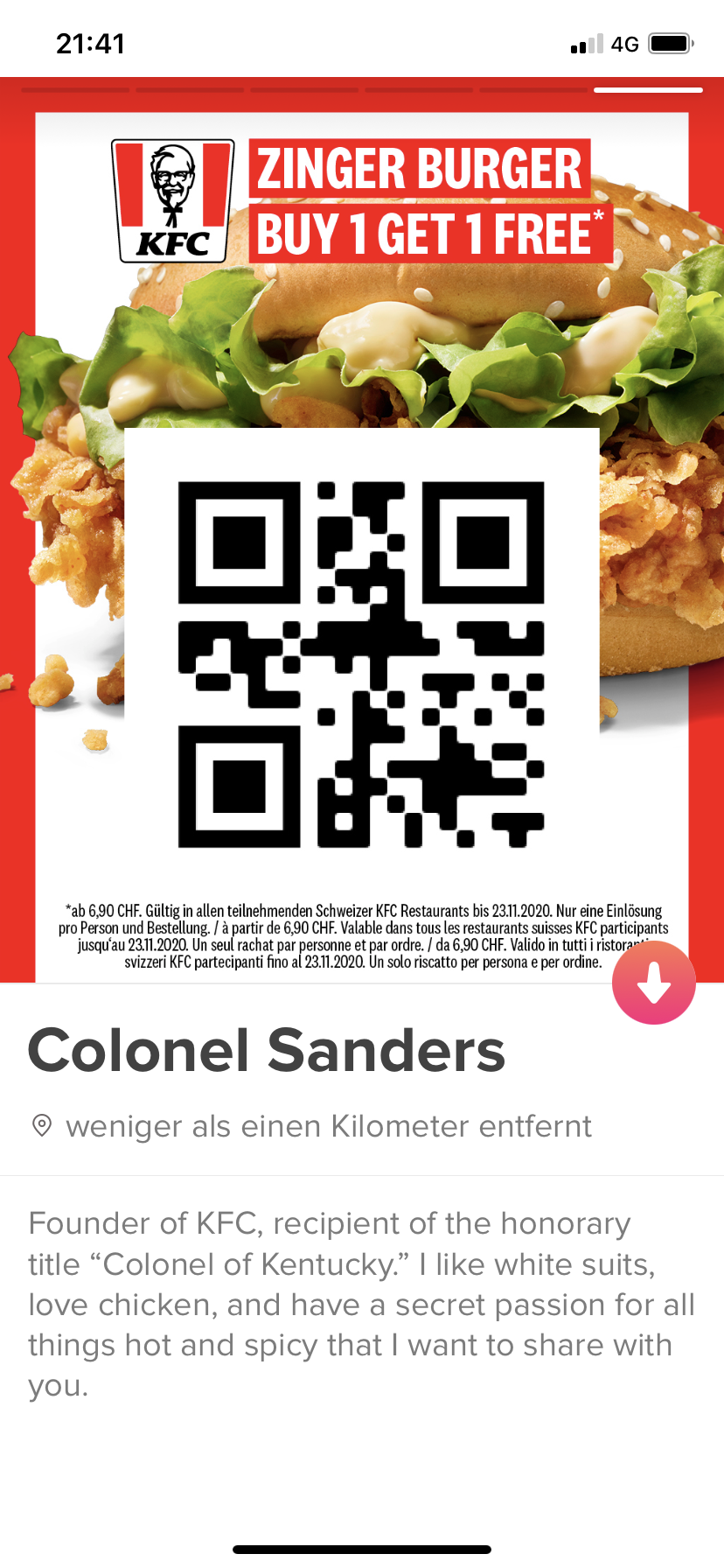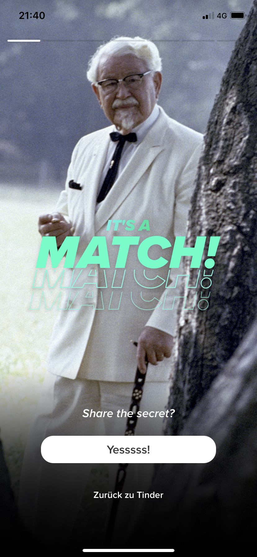 Ich habe aber nach links geswipet und mir gedacht, welcher Trottel macht so ein Fakeprofil mit mehreren Bildern von Colonel Sanders. 🤦