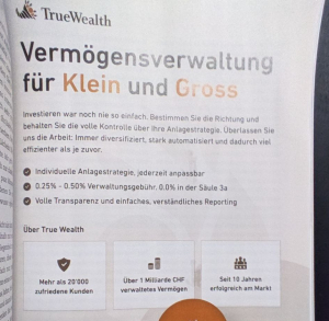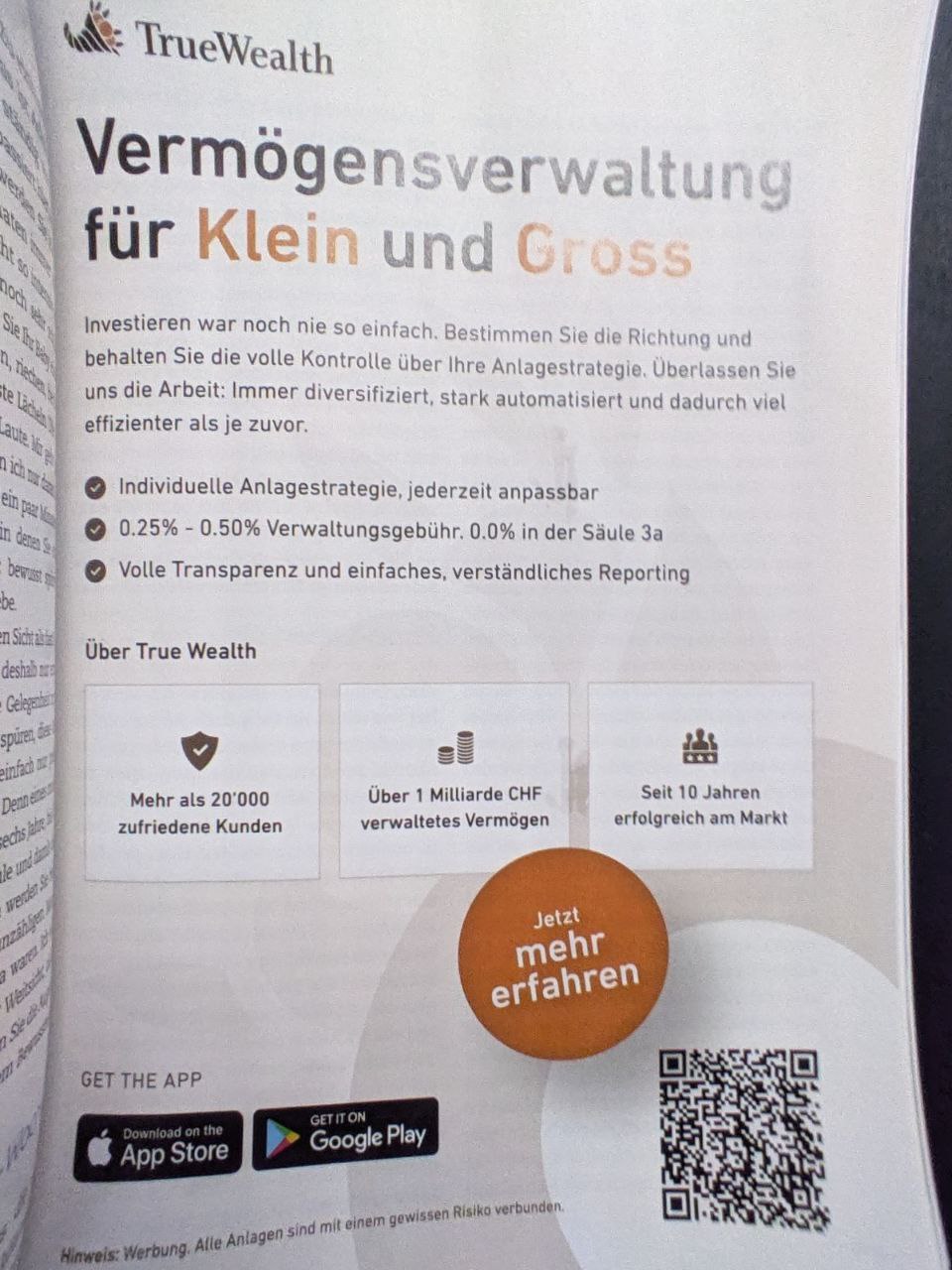 Disclaimer: Ich bin selbst schon länger Kunde bei True Wealth, auch für die 3a, und bin zufrieden damit (hatte frühler schon mal einen Deal dazu verfasst). Sonst wäre mir der Flyer vermutlich gar nicht aufgefallen…