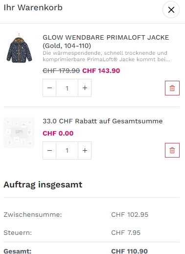 Beim Shop for-k gibt es mit dem Gutscheincode bis am 28.02.2023 CHF 33.- Rabatt ab CHF 99.- Bestellwert. for-k hat hochwertige und nachhaltige Kinderkleider im Angebot, beispielswiese die Schweizer Marke Namuk und die skandinavischen Marken Didriksons und Polarn o. Pyret. Kombiniert mit einer aktuell gültigen Aktion auf Winterjacken ist die Jacke Namuk Glow für 110.90 erhältlich (Vergleichspreis von toppreise.ch: 199.-). Der Versand ist gratis, es gibt ein Rückgaberecht von 10 Tagen. Abholung und Rückgabe sind auch in den Filialen Zug, Luzern und Winterthur gratis möglich.