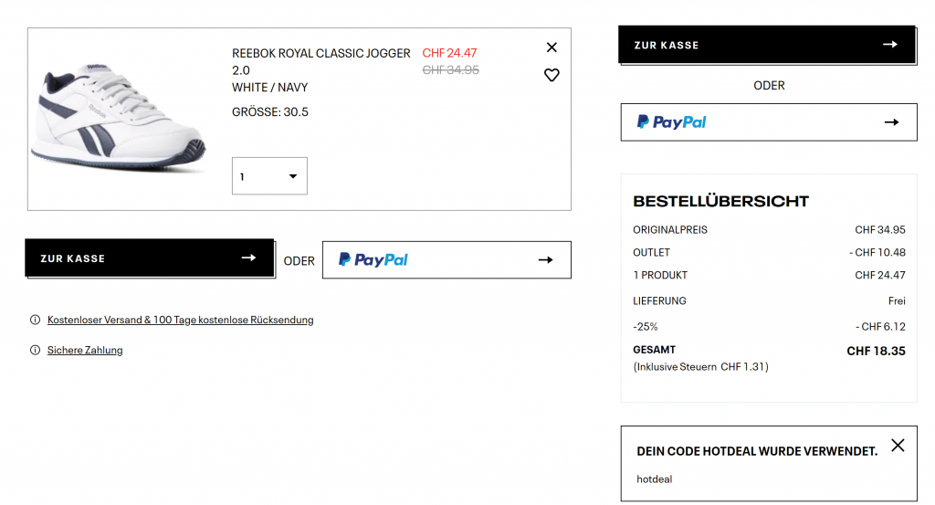 Bei Reebok gibt’s gerade den Kinderschuh Reebok Royal Classic Jogger 2.0 (noch diverse Grössen verfügbar) für CHF 18.35 wenn man den Gutscheincode HOTDEAL beim Checkout eingibt. Aus meiner Sicht ein sehr guter Preis, auch, da der Versand bereits inklusive ist.