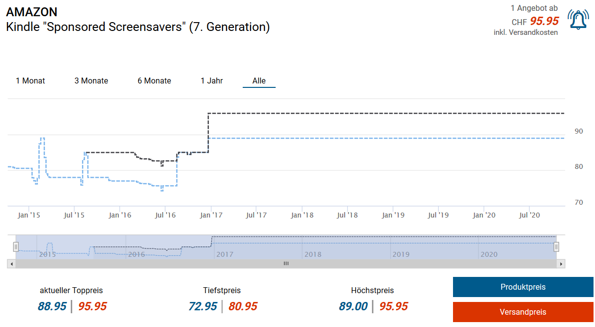 Gemäss dem vorher verfügbaren Preis auf Amazon (78€) sowie dem verfügbaren Preis auf Toppreise (CHF 72.95) ein absolut neuer Bestpreis. Der Preis in CHF wird wie immer bei Amazon erst im letzten Bestellschritt berechnet (wie hier beschrieben INFO: Bestellungen von Amazon mit Lieferung in die Schweiz) .