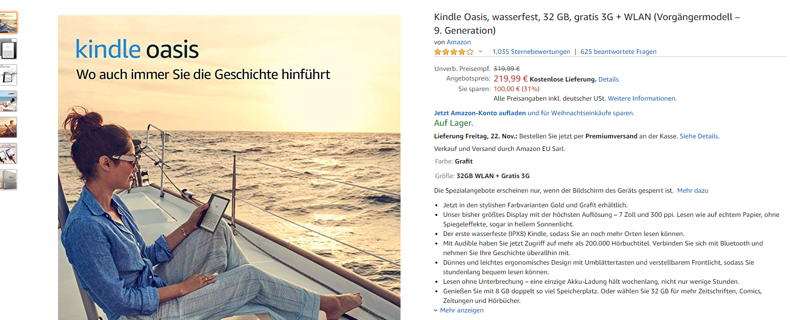 Amazon eröffnet die Rabattschlacht auf seiner Seite - zum Auftakt gibt es die Kindle Oasis 9. Generation enorm reduziert!
