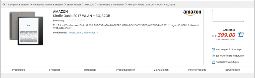 Sorry, dann rechne ich halt um :) Der alte Bestpreis war von Amazon im Juli. Damaliger Kurs ca 1.09, also 249.99€/1.19*1.077*1.09 = 247 Fr. Bei den Sonderangeboten kommt es aber vor, dass der Preis brutto fix ist, man also nicht von der MwSt-Differenz profitiert. In dem Fall hätte der Oasis mit Versand in die Schweiz 272 Fr gekostet.