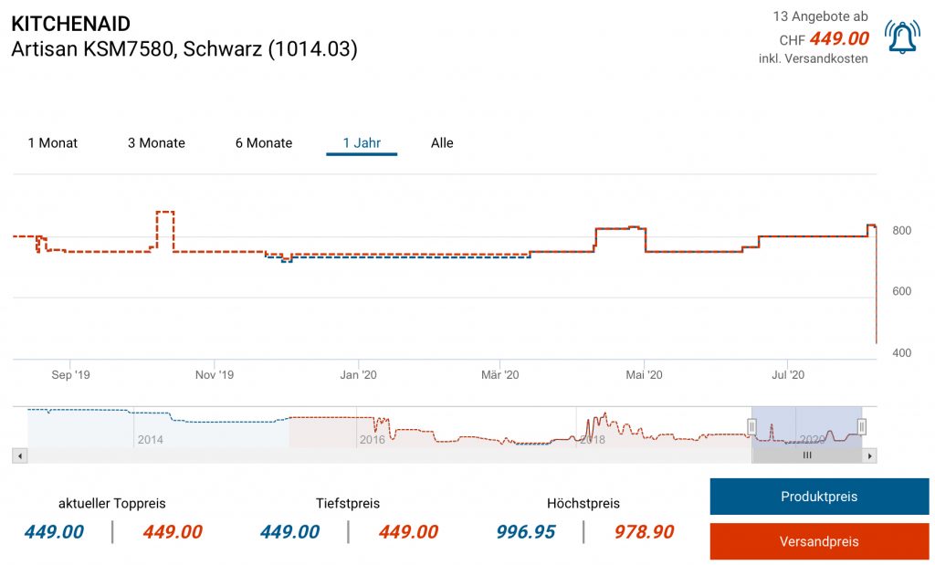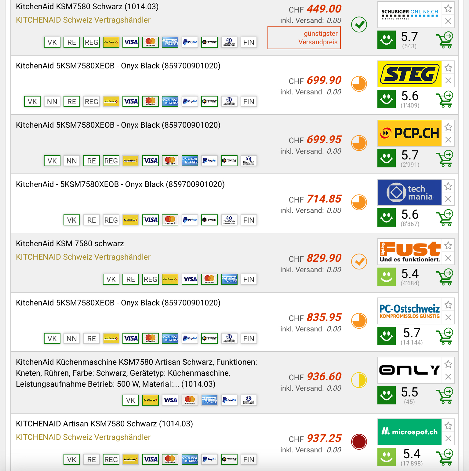 Bei schubiger gibt es aktuell die KITCHENAID Artisan KSM7580, Schwarz für 449.- CHF.