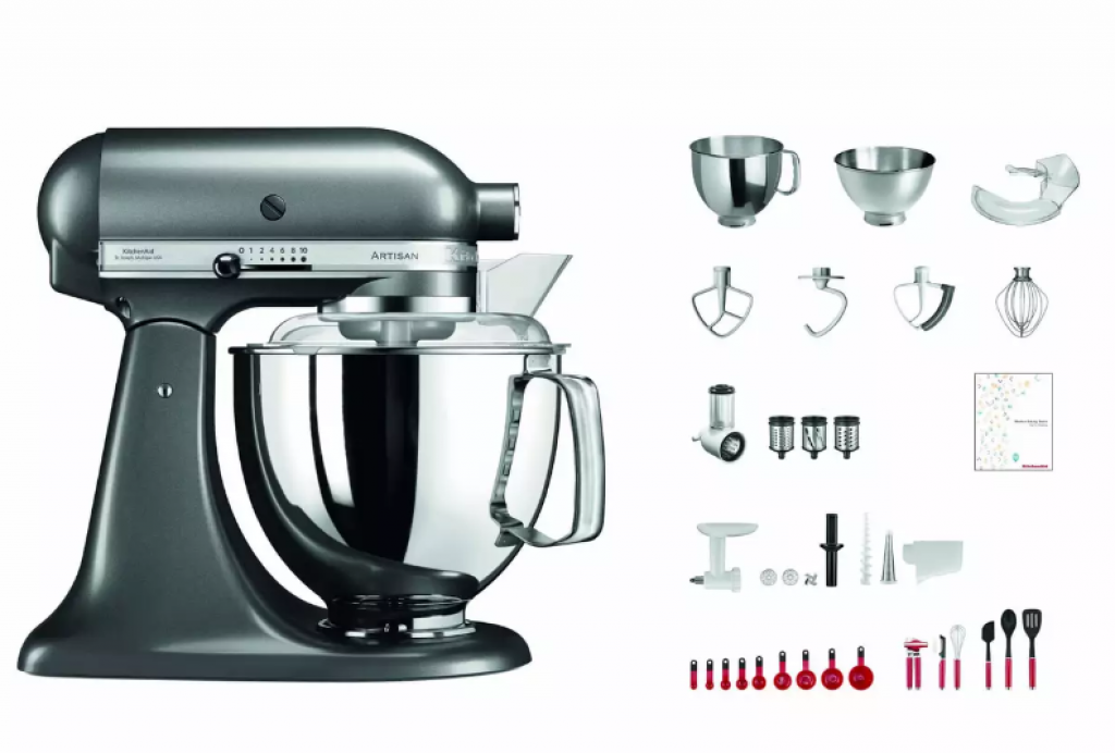 - Ausstattung: Edelstahlschüssel, Flachrührer, Gemüseschneideraufsatz, Knethaken, Pürieraufsatz, Schneebesen, Spritzschutz
