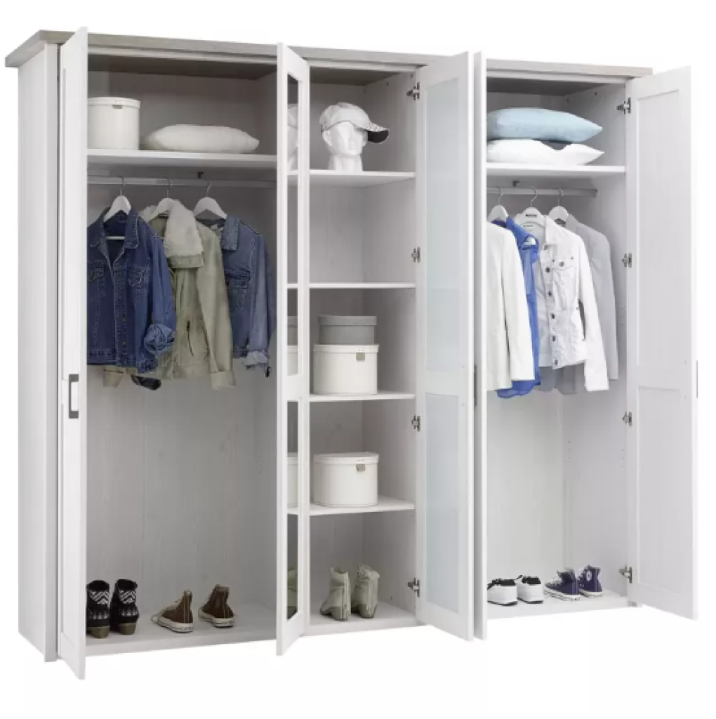 Entdecken Sie den charmanten Kleiderschrank 5trg. Luca in Pinie Weiss und Trüffel Dekor mit grosszügigen Massen von 241 x 212 x 62 cm (BxHxT). Dieser hochwertige Holzdekor-Kleiderschrank bietet reichlich Platz für Ihre Garderobe mit 5 Drehtüren, darunter 3 Spiegeltüren, 6 Einlegeböden und 2 Kleiderstangen für perfekte Organisation. Der Landhausstil verleiht Ihrem Schlafzimmer eine gemütliche Atmosphäre und modernen Flair. Die eleganten Aluoptik-Griffe runden das Design ab. Dieser in Europa gefertigte Kleiderschrank Luca garantiert beste Qualität und Langlebigkeit. Schaffen Sie sich jetzt einen stilvollen und geräumigen Stauraum im Landhausstil für Ihr Schlafzimmer mit dem Kleiderschrank 5trg. Luca. Bitte beachten Sie, dass die Bilder Farbabweichungen aufweisen können, und die Dekoration nicht im Lieferumfang enthalten ist. Holen Sie sich diesen modernen Landhausstil-Kleiderschrank für Ihr Zuhause und geniessen Sie beste Qualität und ein wunderbares Design.