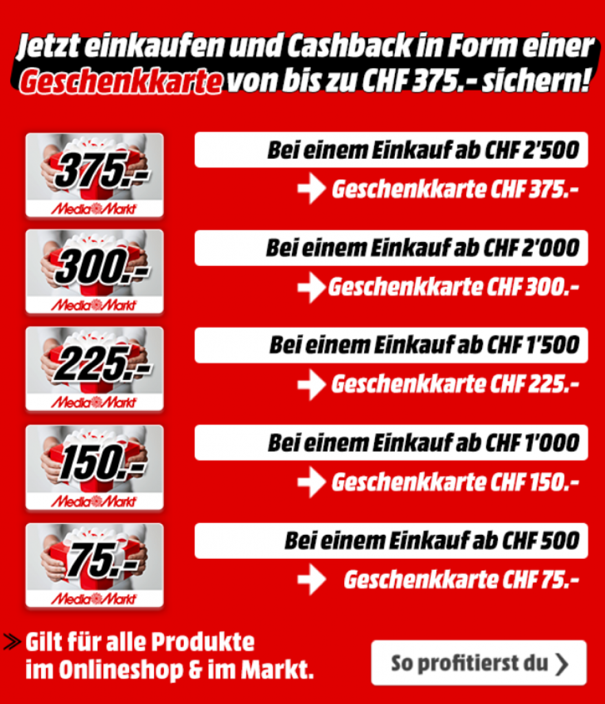 Bei MediaMarkt gibt’s wieder einmal so etwas wie den Red Sunday. Jedoch sind die Geschenkkarten dieses Mal vom Wert her grundsätzlich etwas tiefer. Dafür kann man auch bei höheren Einkäufen profitieren.