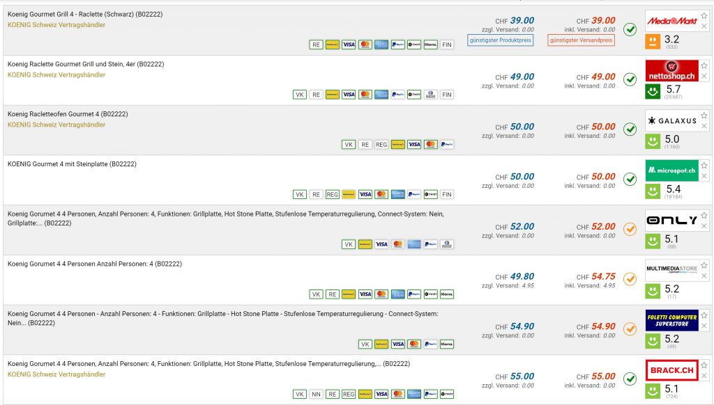 Bei MediaMarkt gibt’s gerade das Raclette-Set KOENIG Gourmet Grill 4 Raclette für CHF 39.- Das Set hat 2 austauschbare Platten mit dabei: Je nach Lust und Laune kann die antihaft-beschichtete Aluminium-Grillplatte (wendbar flach und gerippt) verwendet werden oder der «Heisse Stein» mit besonders grosser Hitzespeicherung und Saftrinne.