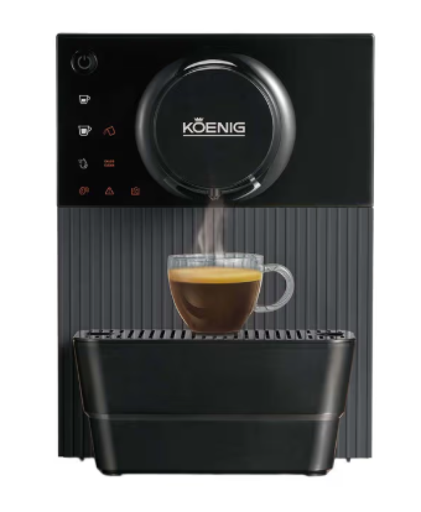 Der Koenig Finessa Nano ist ein kompakter Kaffeevollautomat, der mit nur 29 cm Höhe auch in kleinen Küchen Platz findet. Er bietet individuell einstellbare Tassengrössen für Espresso oder Lungo und überzeugt mit einer patentierten Brüheinheit, die eine einfache Reinigung und konstante Kaffeequalität garantiert. Die Maschine heizt schnell auf und ist in nur 35 Sekunden einsatzbereit, was den Kaffeegenuss besonders komfortabel macht. Das moderne, unaufdringliche Design in Schwarz fügt sich harmonisch in jede Küche ein und macht die Finessa Nano zum idealen Begleiter für bewusste Kaffeegeniesser mit wenig Platz.