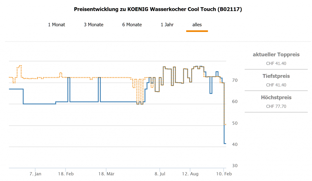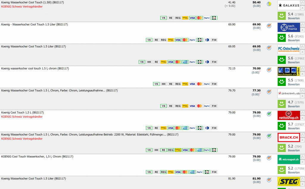Bei digitec gibt’s gerade den Koenig Wasserkocher Cool Touch 1.5 l für CHF 41.40 zzgl. 9 Franken Mindermengenzuschlag. Zweitbester Preis in der Schweiz ist bei CHF 69.90 Bisher nicht unter CHF 59.90 erhältlich.