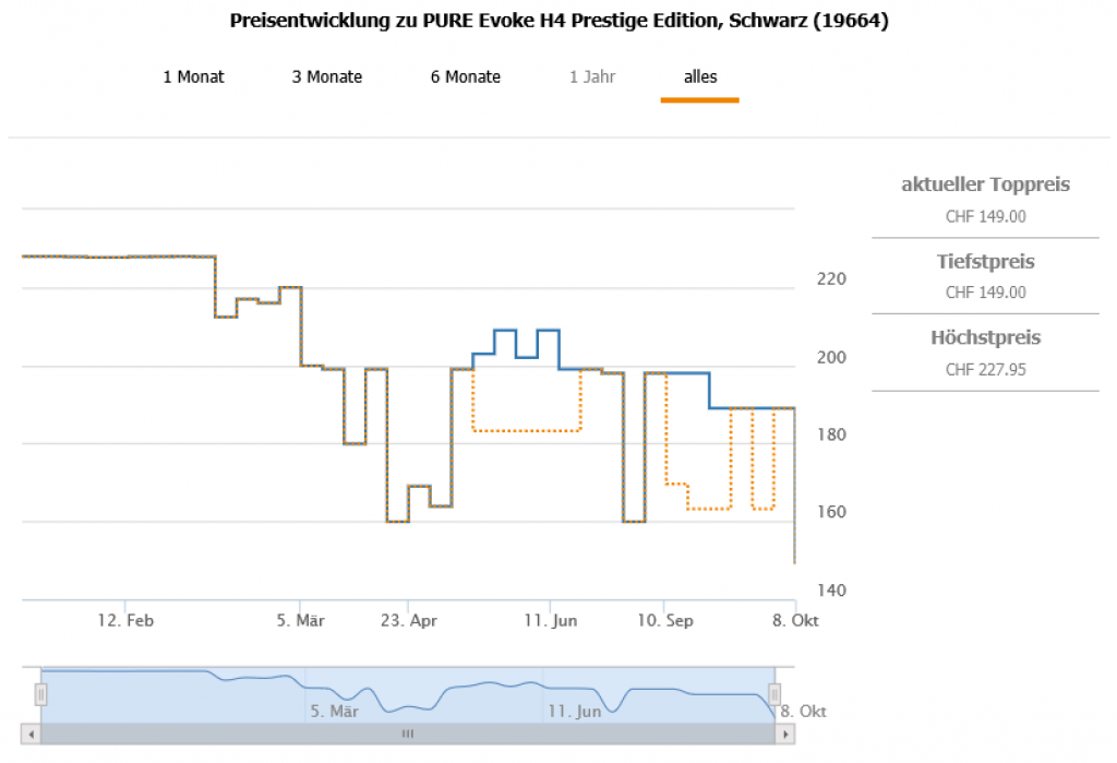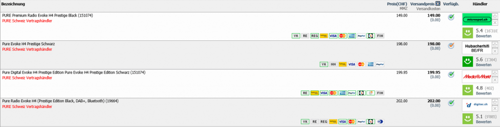 Gemäss toppreise gab es das Radio bislang über alle Farben nie günstiger als für 159.90 CHF, der zweitbeste Preis liegt aktuell bei 198.- CHF.