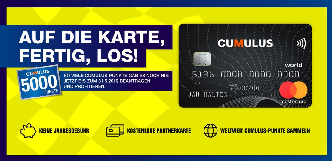 Einfach jetzt die Cumulus-Mastercard ohne Jahresgebühr beantragen und mit satten 5000 Cumulus-Punkten als Startbonus belohnt werden. Ausserdem können Sie mit dem Codewort «Cumulus» die Karte kostenlos in Ihrem persönlichen Design gestalten – wenn Sie den Antrag bis zum 31.5.2019 vollständig ausgefüllt einsenden und dieser bewilligt wird.