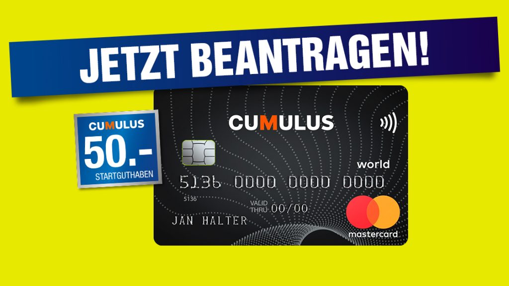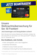 Wenn Sie jetzt die Cumulus-Mastercard anfordern, erhalten Sie eine Gutschrift von 50 Franken zum Start geschenkt!