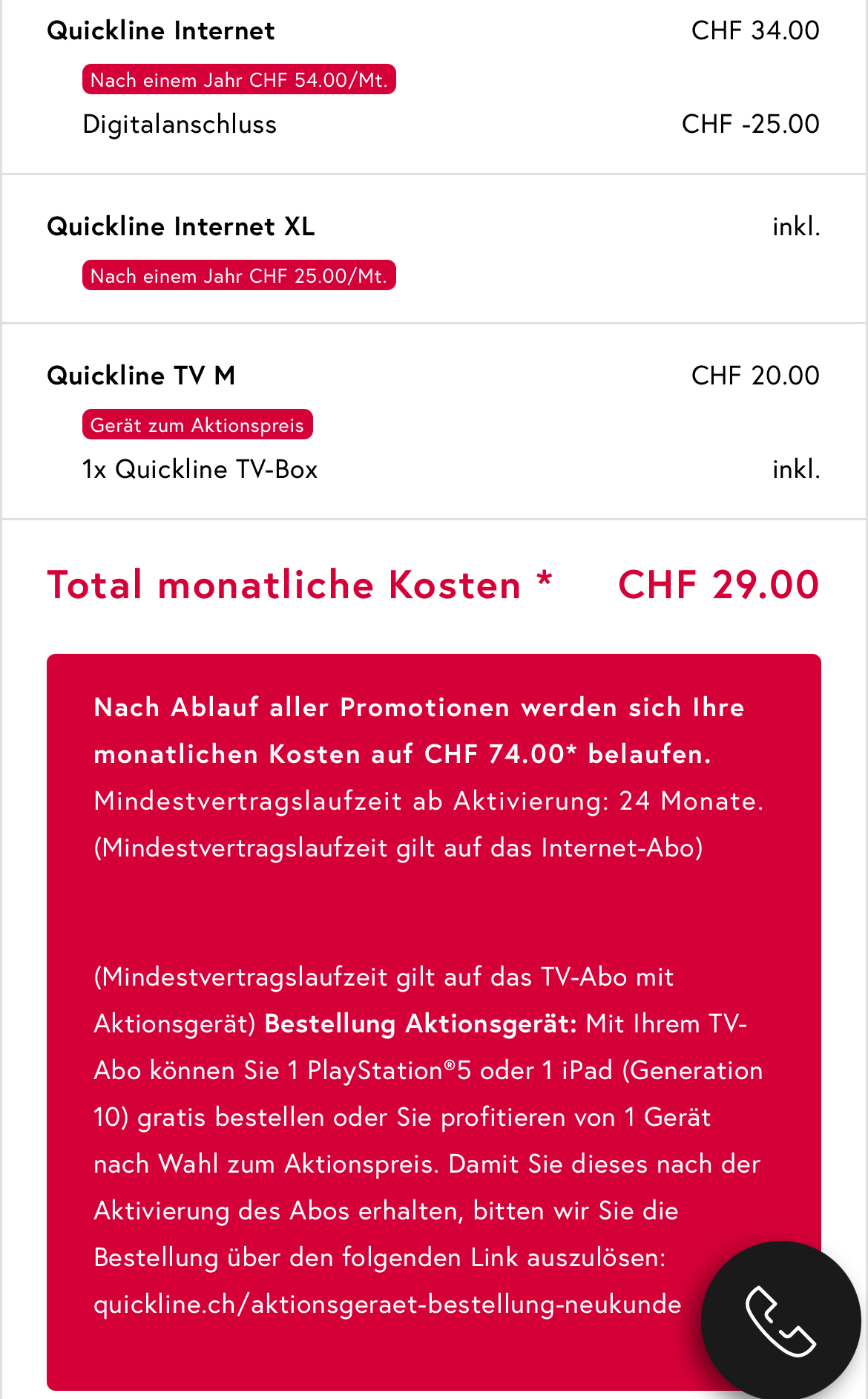 Achtung die Preise gelten nur für Kunden im Quickline Gebiet!