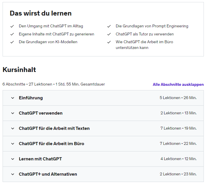 Per Mail habe ich als Udemy-Kunde das Angebot für einen kostenlosen ChatGPT-Kurs erhalten. Ist bestimmt gut für Leute die sich noch nicht so mit dieser Thematik beschäftigt haben. Selber ausprobiert habe ich den Kurs noch nicht, da ich mich bereits ziemlich gut mit ChatGPT auskenne.