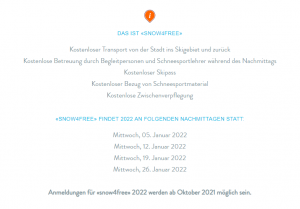 Mittlerweilen durften bereits über 30 000 Kinder im Alter von 9 bis 13 unbeschwerte Mittwochnachmittage im Schnee geniessen – und dies vollkommen kostenlos. Winterausrüstung, Skipass und Zwischenverpflegung stehen bereit und der Transport ins Skigebiet ist ebenfalls organisiert. Erfahrene Begleitpersonen und Schneesportlehrer betreuen die Kinder von A bis Z. Daten und Orte: https://www.snow4free.ch/de/daten-orte/articles/daten_orte.html