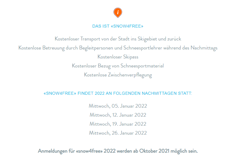 Mittlerweilen durften bereits über 30 000 Kinder im Alter von 9 bis 13 unbeschwerte Mittwochnachmittage im Schnee geniessen – und dies vollkommen kostenlos. Winterausrüstung, Skipass und Zwischenverpflegung stehen bereit und der Transport ins Skigebiet ist ebenfalls organisiert. Erfahrene Begleitpersonen und Schneesportlehrer betreuen die Kinder von A bis Z. Daten und Orte: https://www.snow4free.ch/de/daten-orte/articles/daten_orte.html