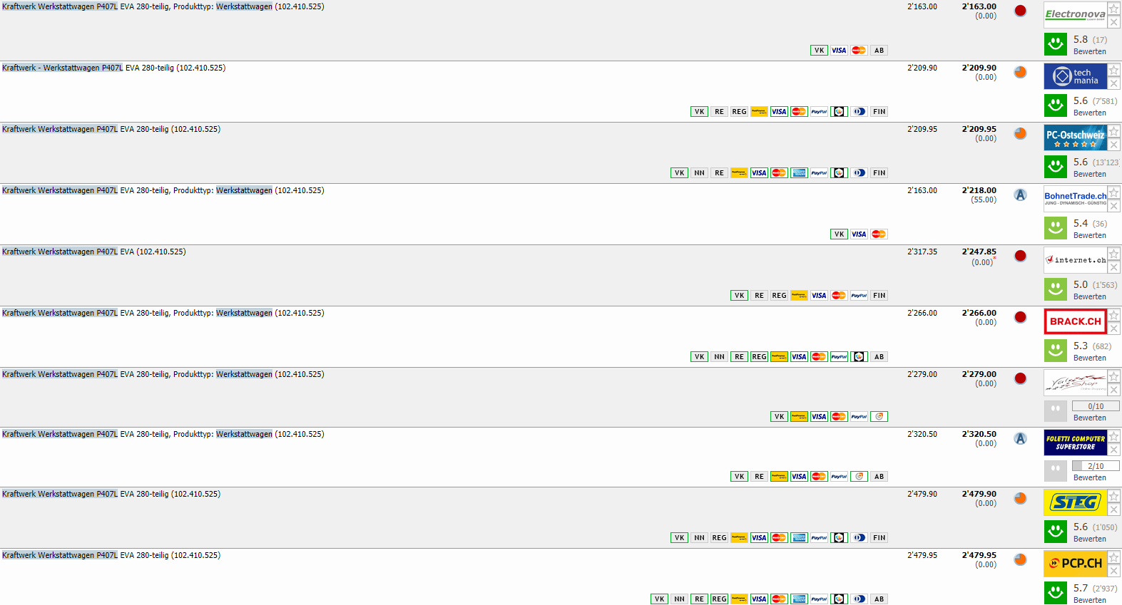 Galaxus bietet aktuell den Kraftwerk Werkstattwagen P407L, bestückt, PB/HT (315x) für CHF 1750.-. Laut eigenen Angaben kostet der Wagen sonst CHF 2750.- bei Galaxus.