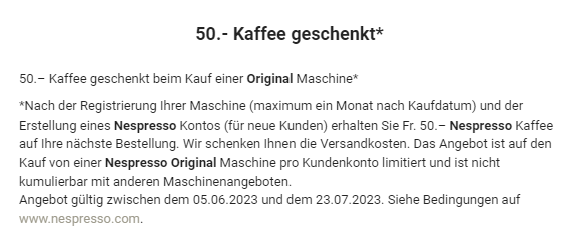 Wenn ihr eure Maschine bei Nespresso registriert oder ein Konto erstellt , erhaltet ihr zudem noch einen CHF 50.- Gutschein für euren nächsten Einkauf.