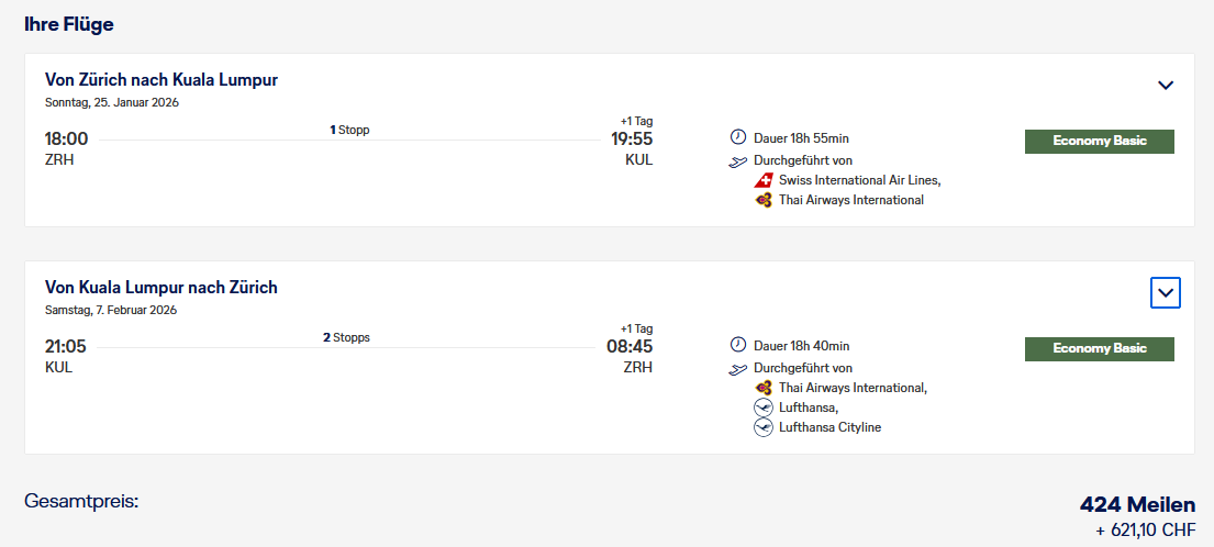 Ich habe  soeben eine Reise nach Kuala Lumpur in Mai 2026 gebucht. Entweder hat man 2 Stopps bei der Hinreise oder Rückreise. Fluggeräte sind Airlines in der Star Alliance Gruppe, Swiss/Austrian Airlines/Thai/Singapore oder Lufthansa. Ich habe eine Verbindung mit der Lufthansa, da ich wieder mal A380 fliegen wollte. Nach der Buchung kann ein Upgrade in de Premium Eco, ca. 300 CHF pro Weg, nur auf der langen Strecke oder ein Gebot in die Premium Eco oder Business  abgegeben werden. Auch hier nur für die Lange Strecke ab 200 CHF Business ab CHF 950.- OneWay.