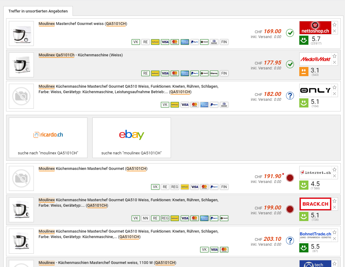 Bei Nettoshop gibts derzeit die Küchenmaschine Masterchef Gourmet von Moulinex zum guten Preis von 149 Franken (inkl. 20 Franken Bon). Laut toppreise wäre Mediamarkt mit knapp 178 Franken der zweitgünstigste Anbieter.