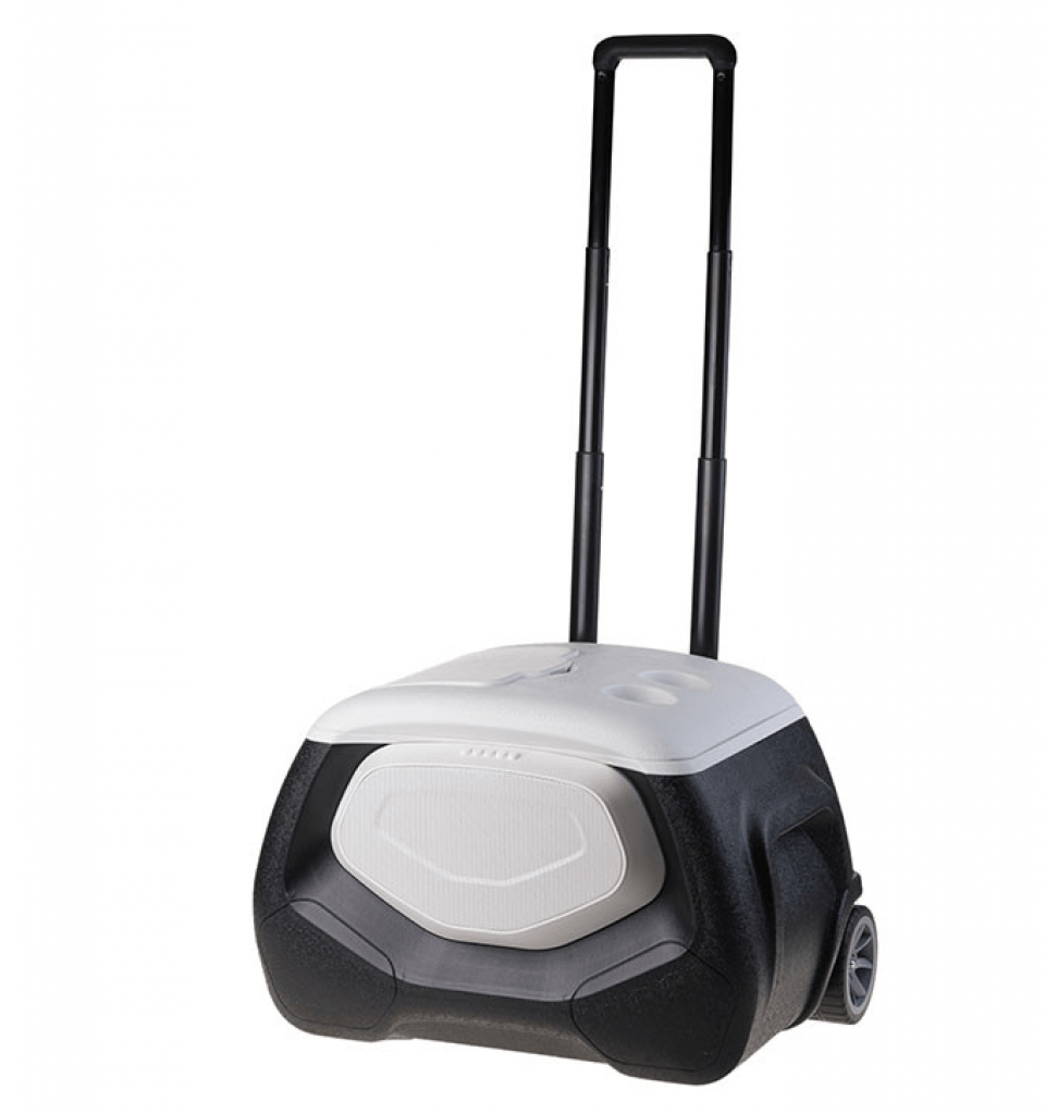 Die Kühlbox hat ausserdem Räder, damit du nicht zu schwer schleppen musst und einen praktischen Halter.