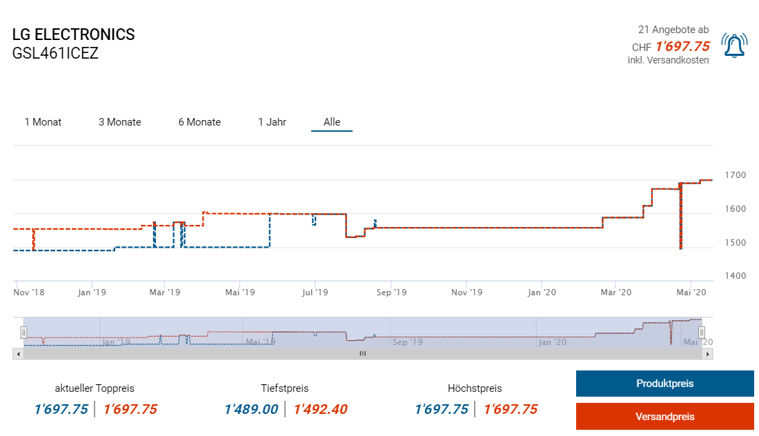 Bei Daydeal gibts diese Woche im Deal of the Week den Kühlschrank GSL461ICEZ von LG zum neuen Bestpreis, laut toppreise. Zwar wird dort auch ein bisheriger Bestpreis von knapp 1493 Franken behauptet, ob das auch wirklich so ist kann ich aber nicht sagen, zumal ich wo anders den Kühlschrank für knapp 1495 Franken gesichtet habe.