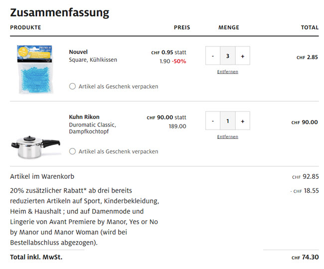 Beim Manor Sale gibt es nebst den bis zu 70% auf ausgewählten Produkten nochmals zusätzlich 20% Rabatt beim Kauf ab drei reduzierten Artikeln. Damit man einfach und kostengünstig auf die 20% Zusatzrabatt kommt, kann man sich drei Stück dieser günstigen Kühlkissen in den Warenkorb legen und danach beim Wunschartikel vom Zusatzrabatt profitieren. Somit ergibt sich dann z.B. der Preis von CHF 74.30 für den Kuhn Rikon Duromatic Classic Dampfkochtopf (20cm /3.5L) bei Abholung in einer Manor Filiale. Ab einem Mindestbestellwert von CHF 100.- kann auch noch der Newslettergutscheincode WELCOME19 verwendet werden, welcher nochmals zusätzlich CHF 10.- Rabatt ermöglicht.