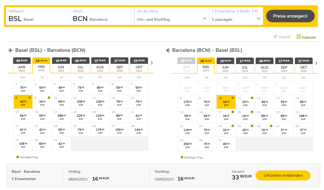 Bei Vueling gibt’s zurzeit einige günstige Flugangebote! Zum Beispiel könnt ihr die Route BSL-BCN-BSL für nur 33.98 an verschiedenen Daten im Mai und Juni. Im Juli und September sind die Preise für die Hinreise etwas höher, dafür ist die Rückreise weiterhin für knapp 17 resp. 18 Franken buchbar.